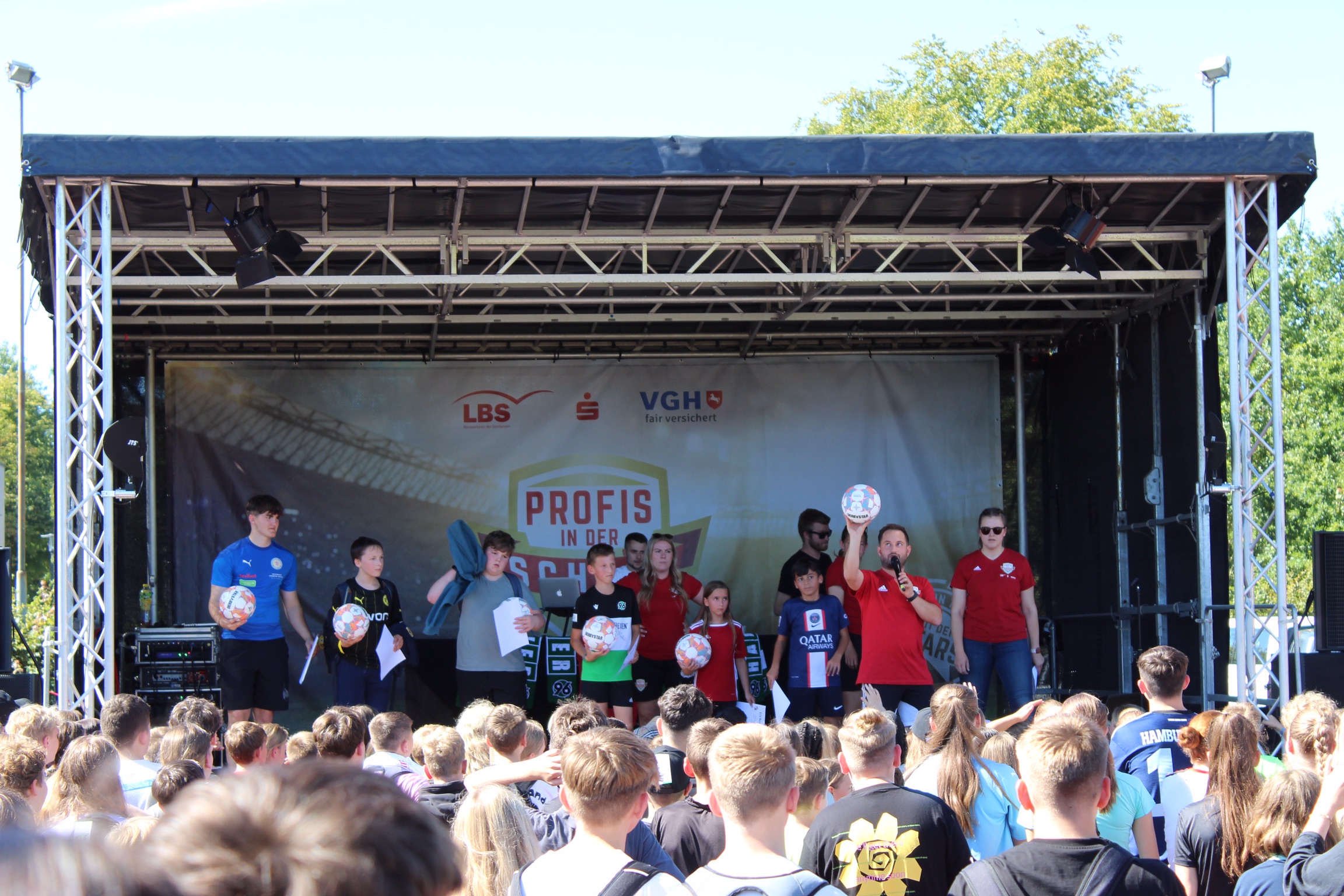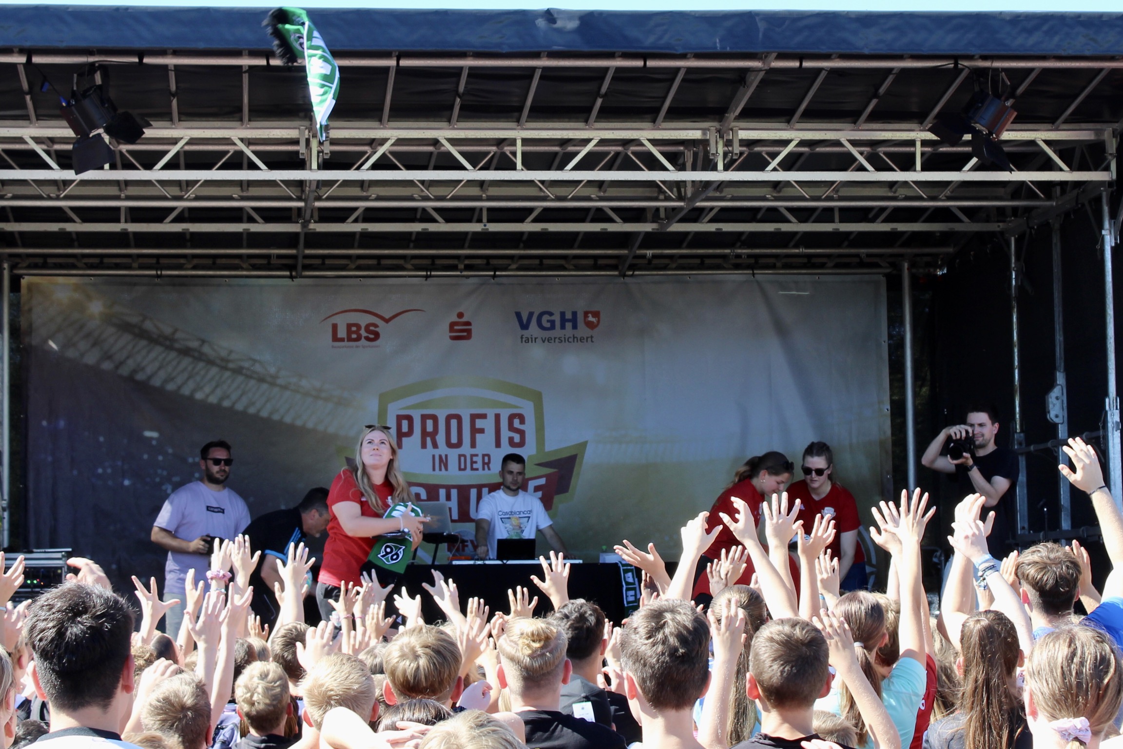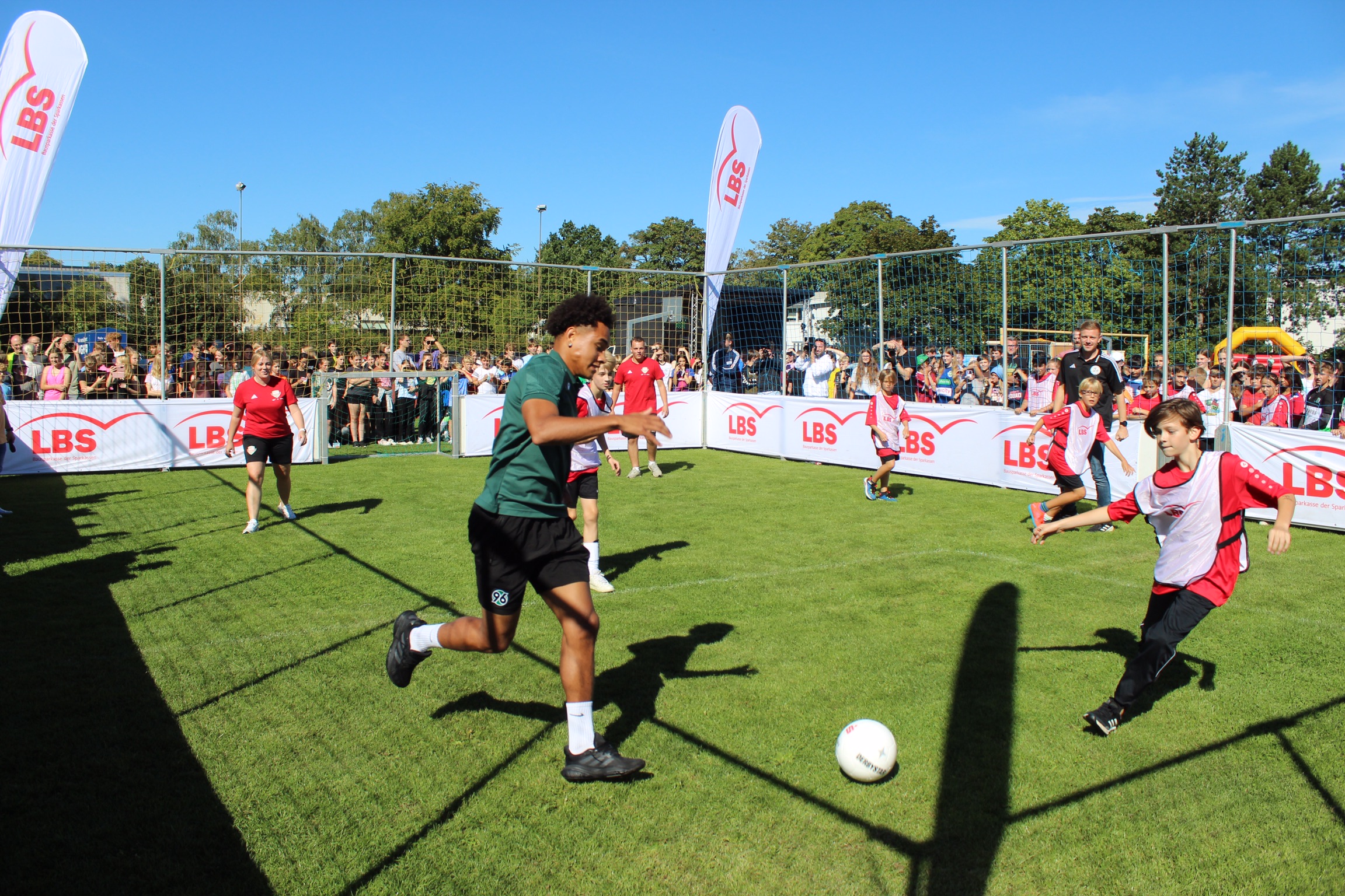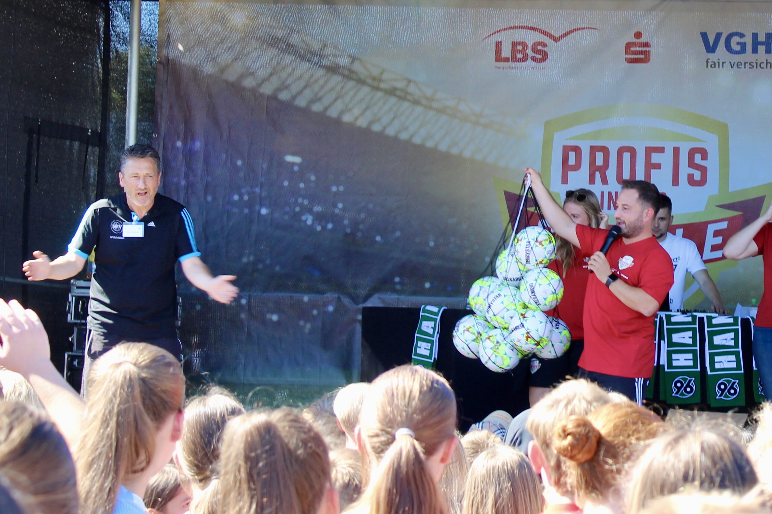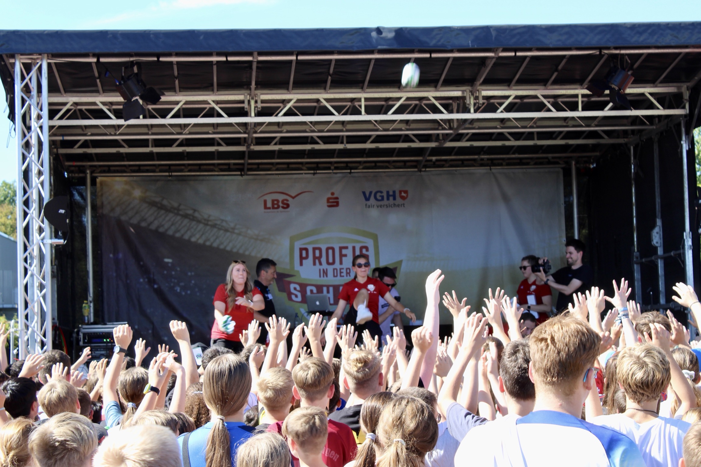 Die Erwartungen an das Event waren bei strahlendem Sonnenschein riesengroß und wurden definitiv nicht enttäuscht. Dank der Planung des 12. Jahrgangs in der Projektwoche und der Bereitstellung des Fußball-Equipments sowie einer Entertainment-Bühne durch den Niedersächsischen Fußball Verband (NFV) wurde die Großveranstaltung ein voller Erfolg. Die Schüler*innen waren hellauf begeistert, als sie erfuhren, dass sie die 96-Profis aus nächster Nähe erleben durften und durch die Aktionen hautnah mit den Profis interagieren konnten.